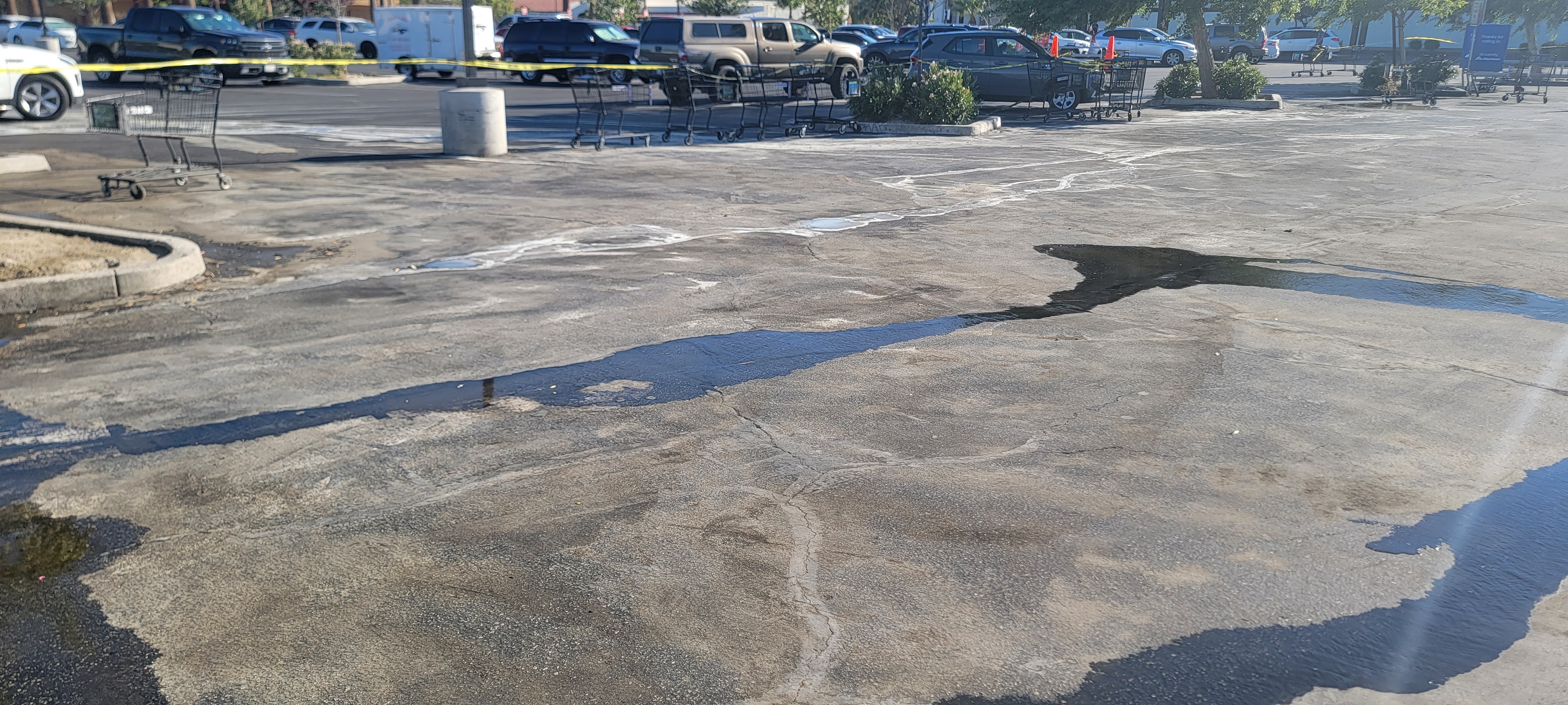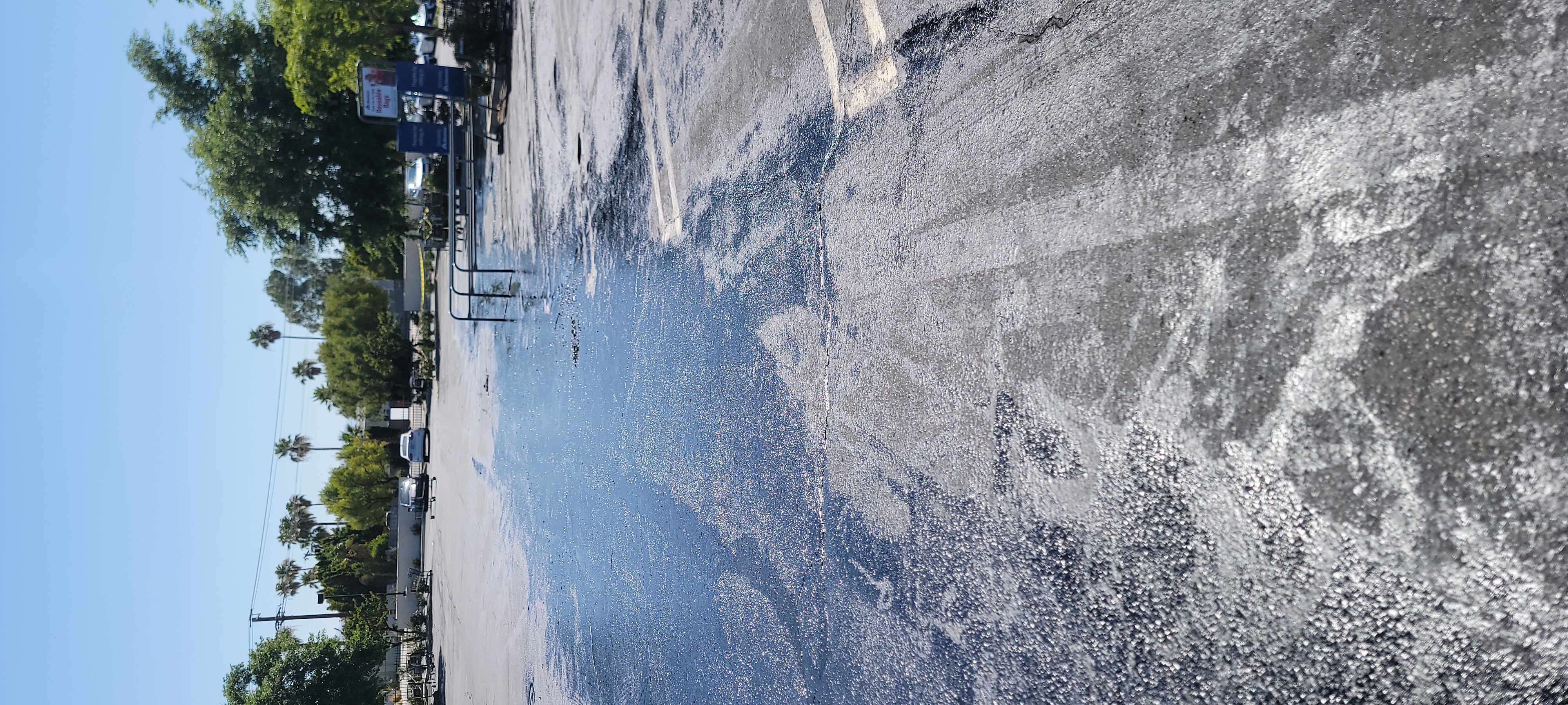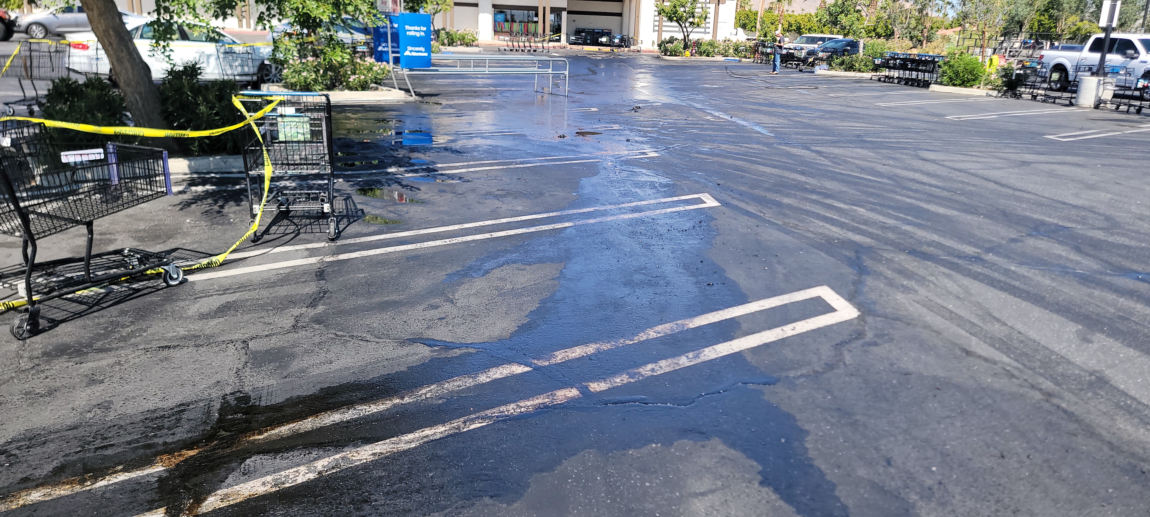 Company gave us a call late evening about a grease trap overflow clean up in Palm Springs, CA, initially was told it was a 20x20 area, after arriving and taking a look at it we realized right away it was a lot bigger of a clean up. We gave our price and they agreed, this job is different, grease if very thick and asphalt is petroleum based so you can really use degreaser and high pressure as it could damage the asphalt. We used a lot of oil absorbent sand and kitty litter to help absorb most of the grease, after words we scrapped and picked up the sand/litter. We used hot water to help with the rinse at the end, this job took a couple days of work being it was grease on asphalt. These types of jobs are considered Hazmat due to the nature of the job.