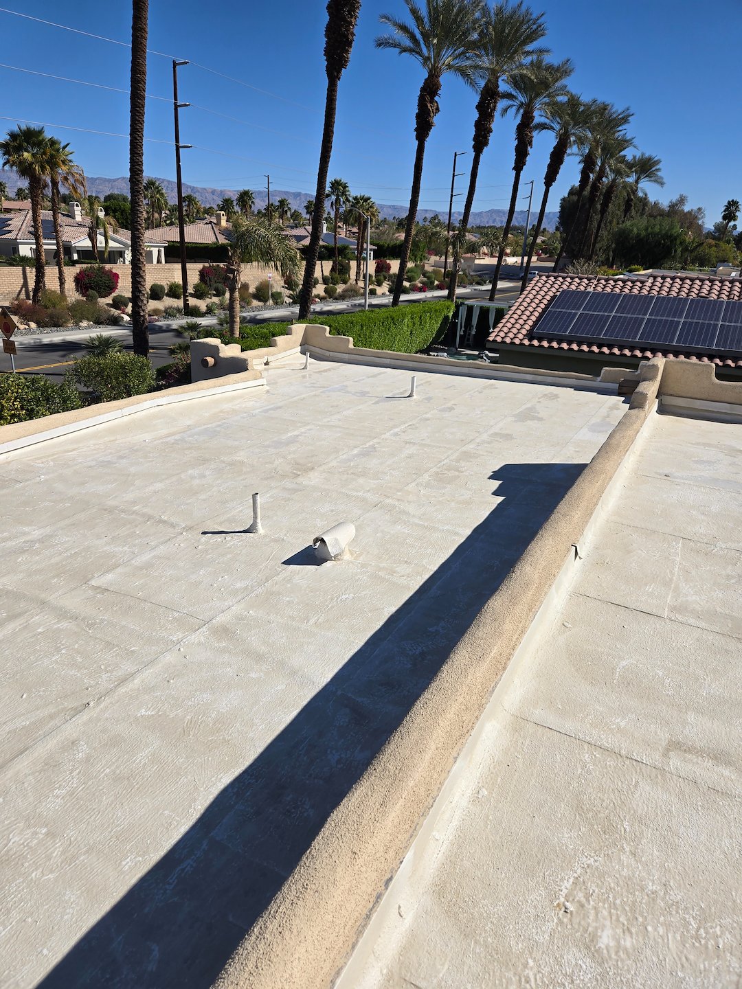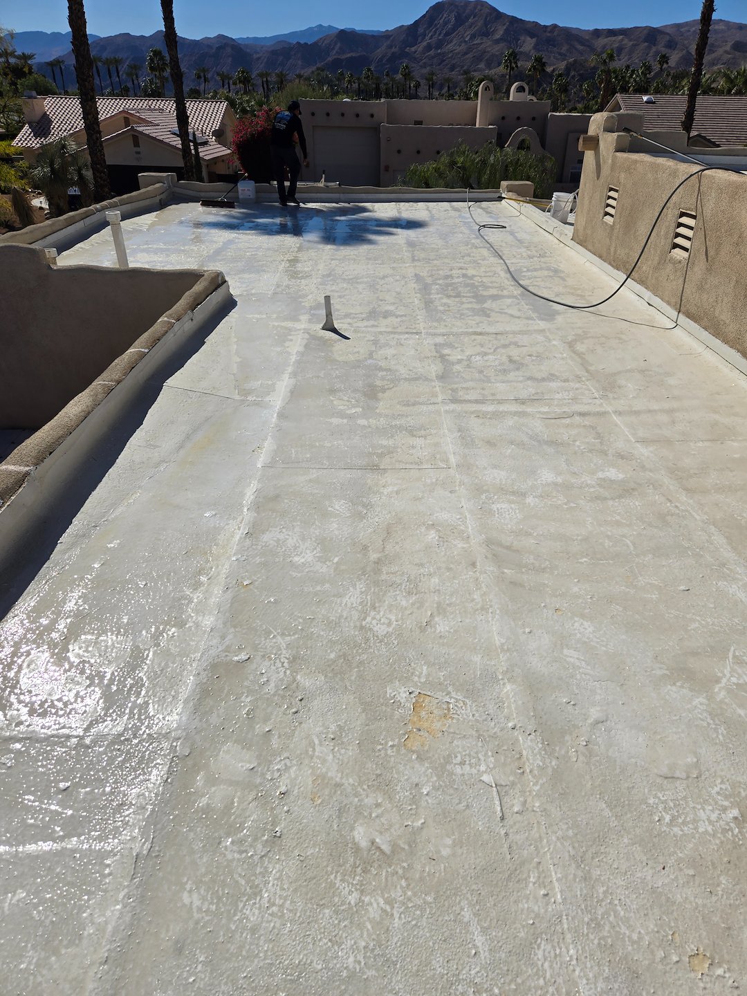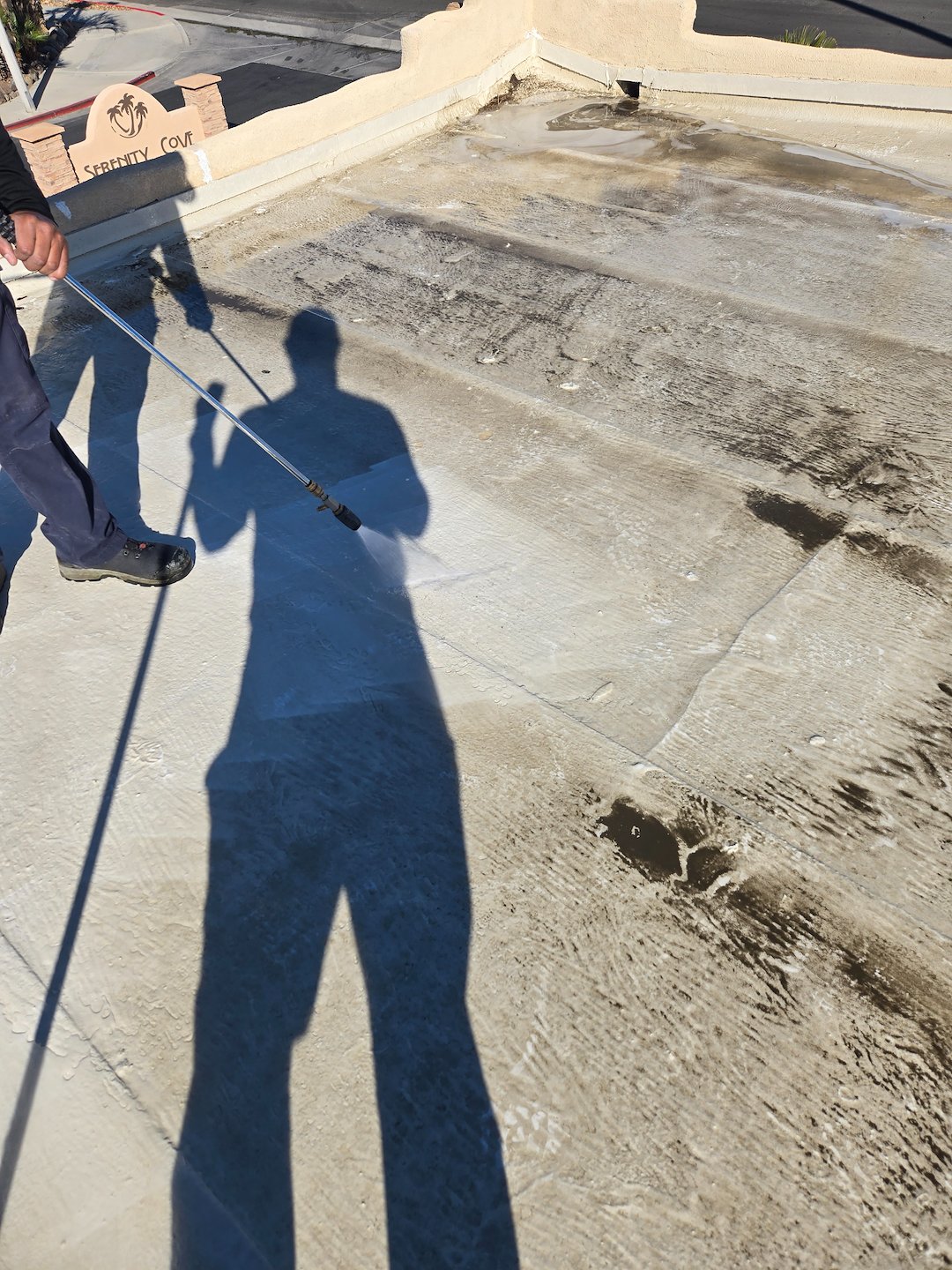 Customer called for a Roof cleaning estimate, we provided our estimate to the customer along with our steps to cleaning this roof. Roof was flat and coated with a white coating that can be damaged with high pressure. We applied our cleaning solution and agitated with a brush then rinsed with low pressure. This roof was located in Cathedral City, Ca. Customer was super happy with results and left us a 5 star google rating