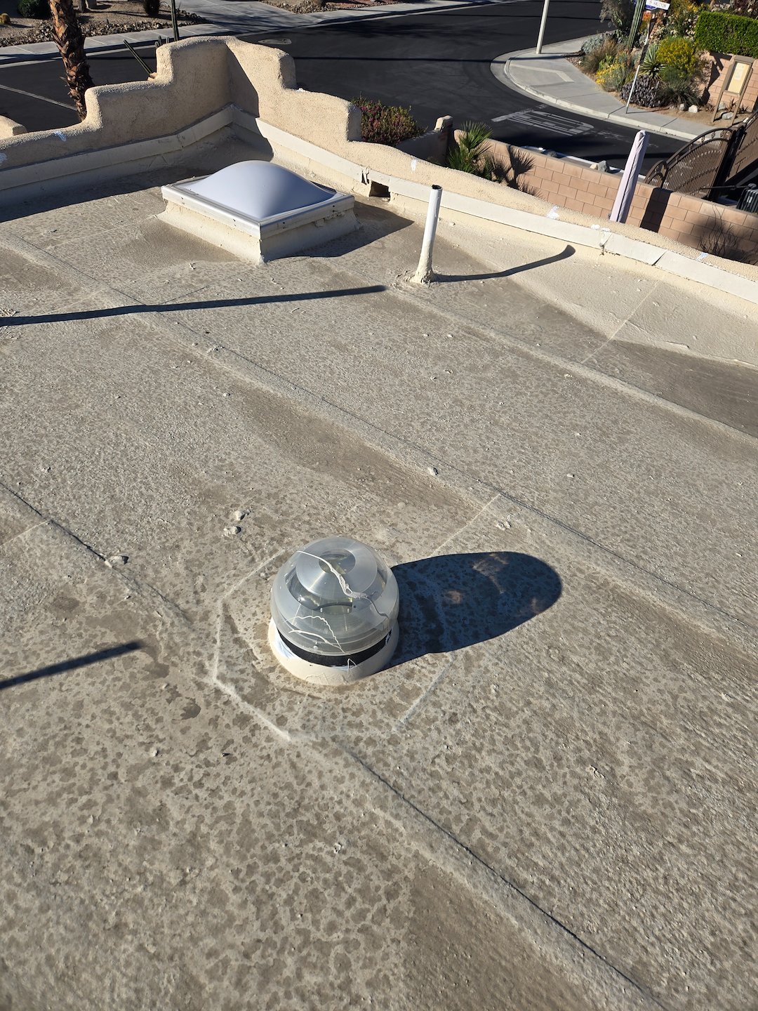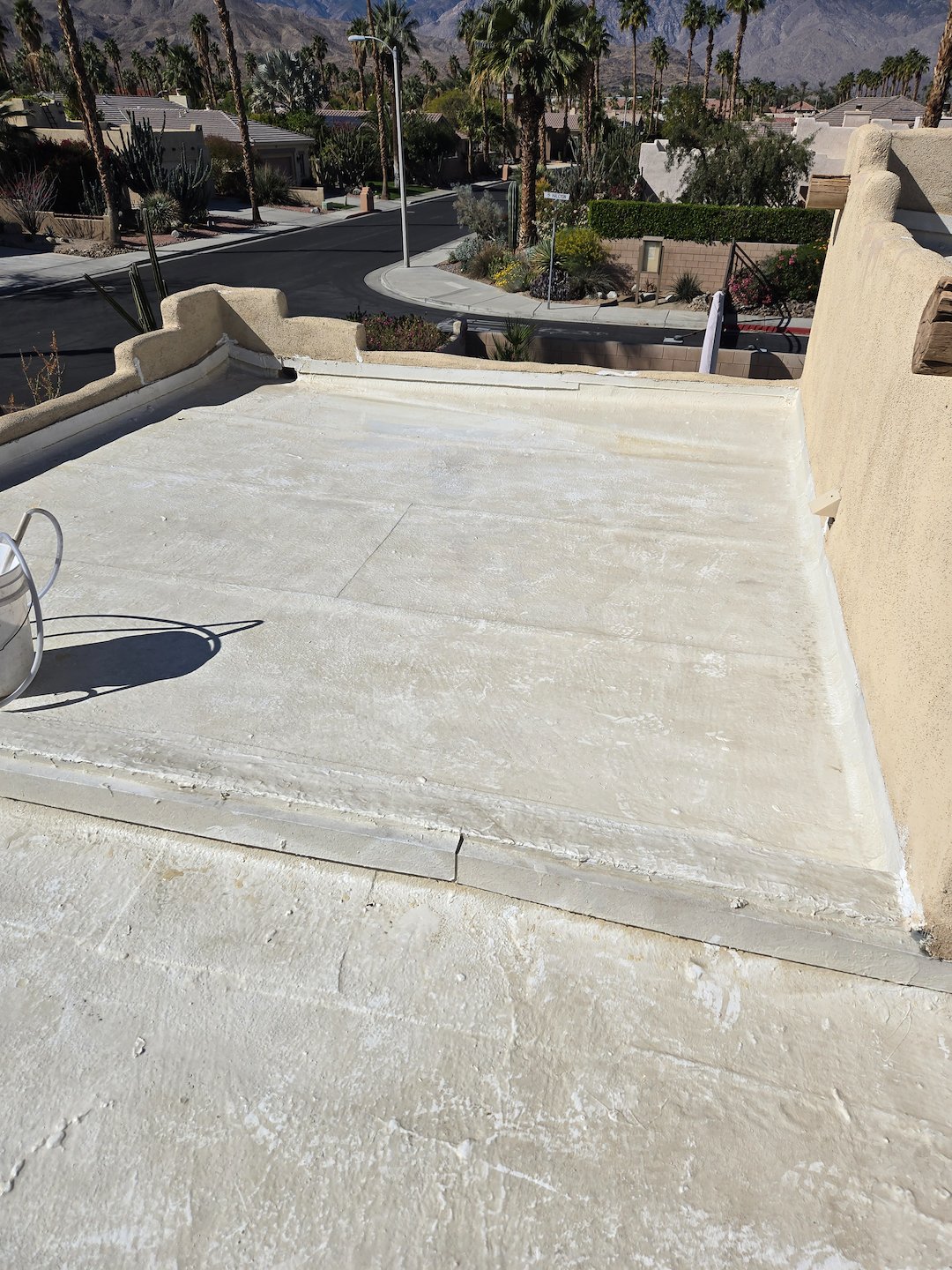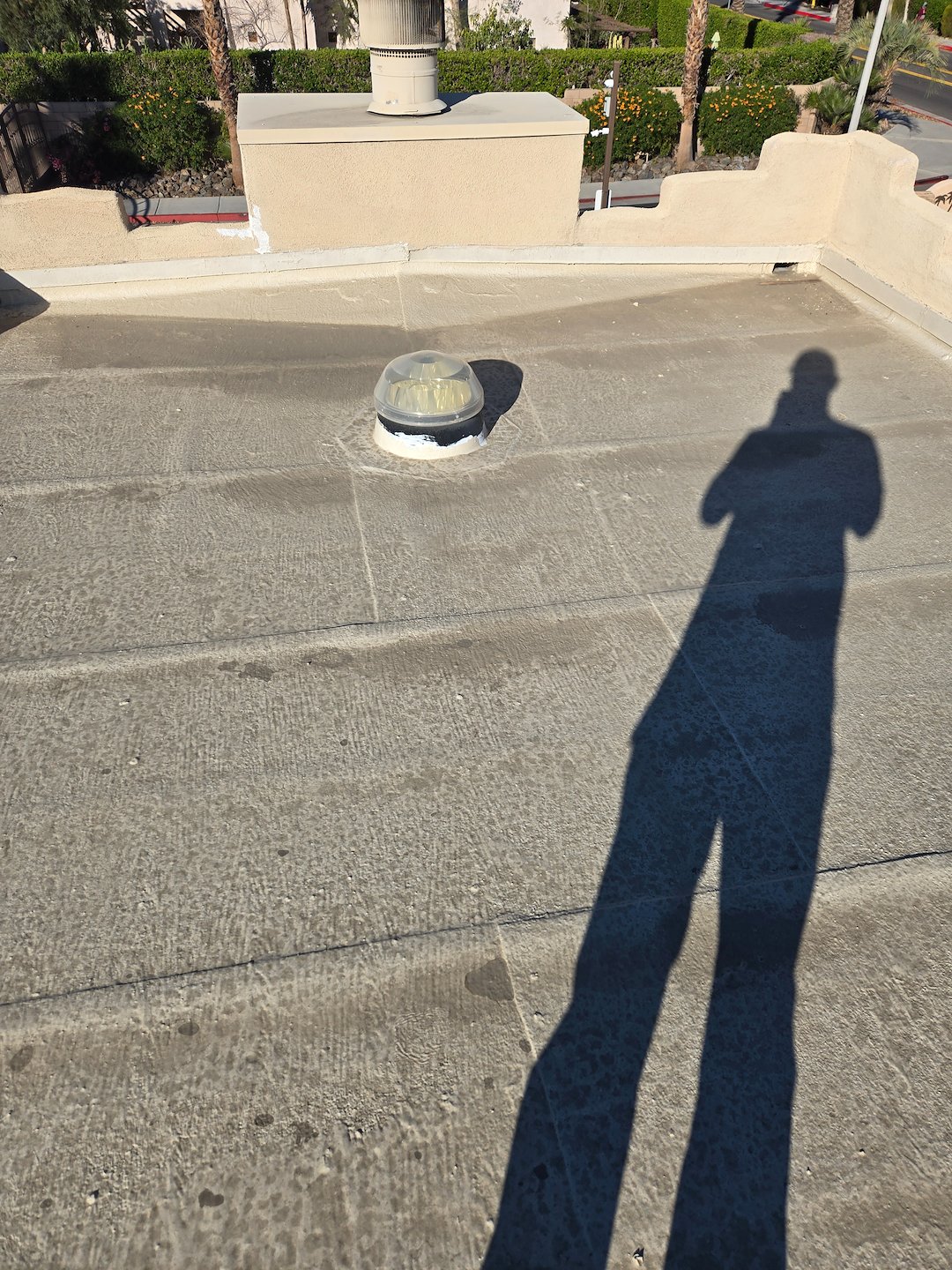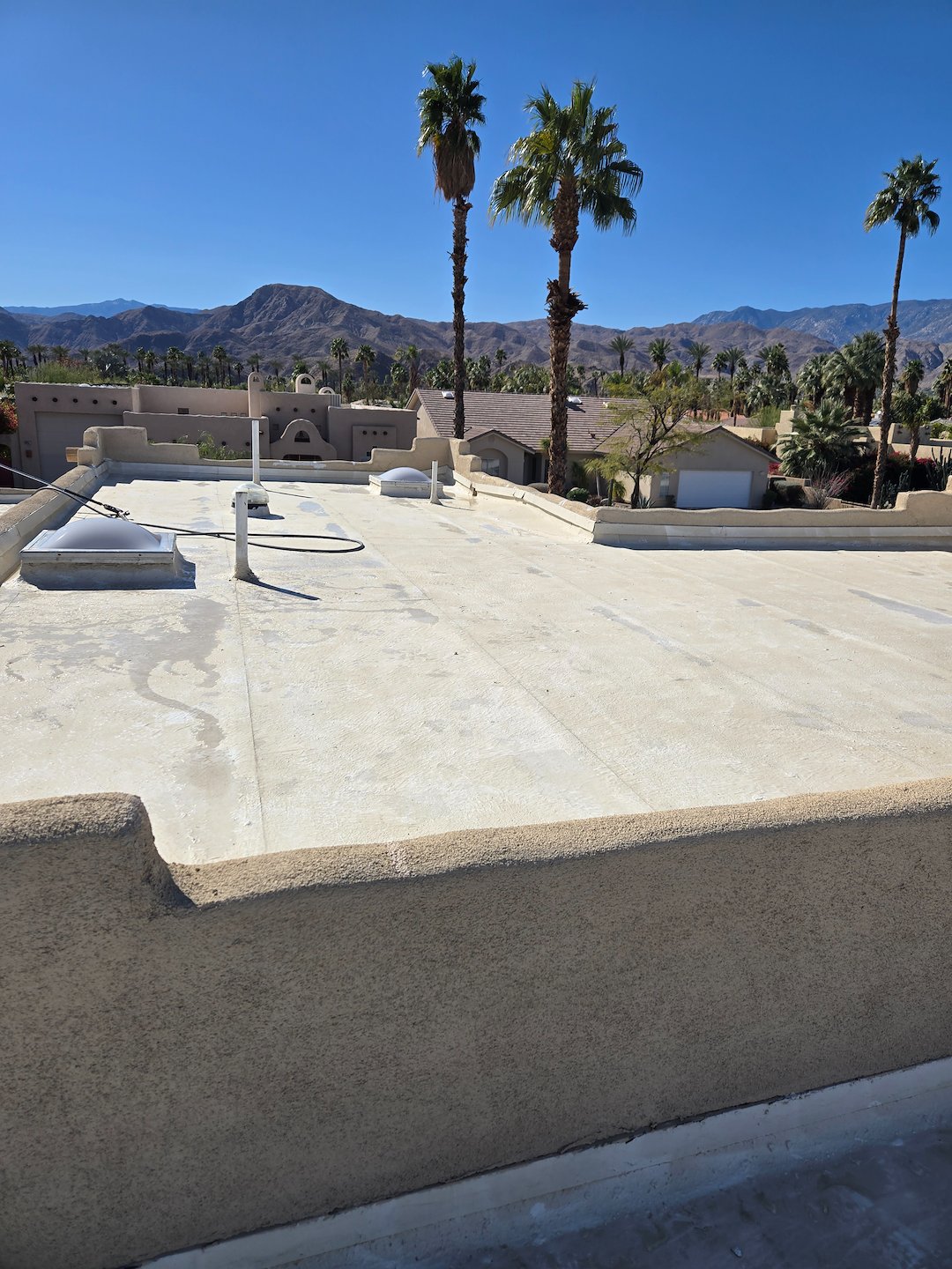 Customer called for a Roof cleaning estimate, we provided our estimate to the customer along with our steps to cleaning this roof. Roof was flat and coated with a white coating that can be damaged with high pressure. We applied our cleaning solution and agitated with a brush then rinsed with low pressure. This roof was located in Cathedral City, Ca. Customer was super happy with results and left us a 5 star google rating